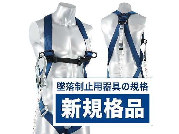 新規格対応!リーズナブルながら、必要な機能はしっかり備えた「エントリーモデル」 ●ランヤード付オールラウンドフルハーネス ●エントリーモデル ●2019年2月制定の「墜落制止用器具の規格」に基づくフルハーネス ●仕様 ・肩 腿ベルト:幅45mmポリエステル ・胸ベルト:幅25mmナイロン ・肩バックル:スチール ・胸クリップ:プレートタイプ(スチール) ・腿バックル:プレートバックル(スチール) ・D環:スチール ・休止フック掛け(2個),ベルト保持版,尻当て,ベルト止め:樹脂 ・ランヤード:直径10mm 3ッ打ナイロン 長さ1700mm ・ショックアブソーバー 第一種 ・丸リング スチール ・フック No.57(スチール) ・質量 約1370g(ランヤード含む) ・原産国:日本