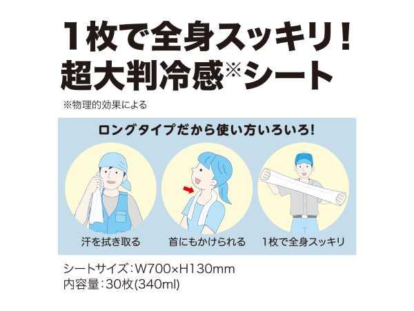 1枚で全身スッキリ!超大判冷感シート! ●しっかりと汗を拭き取ってスッキリすることができる ●厚手・丈夫 ●超大判冷感シート ※物理的効果による ・シートサイズ:W700×H130mm ●ロングタイプだから使い方いろいろ! ・汗を拭きとる ・首にもかけられる ・1枚で全身スッキリ、シートは両面使える ● 30枚入 ■ 仕様 ・本体サイズ・質量:105mm×105mm×170mm・580g ・成分 水、エタノール、BG、メントール、ハッ力油、 ヒアルロン酸Na、イソステアリン酸PEG-25グリセリル、 EDTA-2Na、ベンザルコニウムクロリド、 フェノキシエタノール、メチルパラベン ・内容量:30枚(340ml) ・材質 容器、フタ、内袋:プラスチック ・原産国:日本