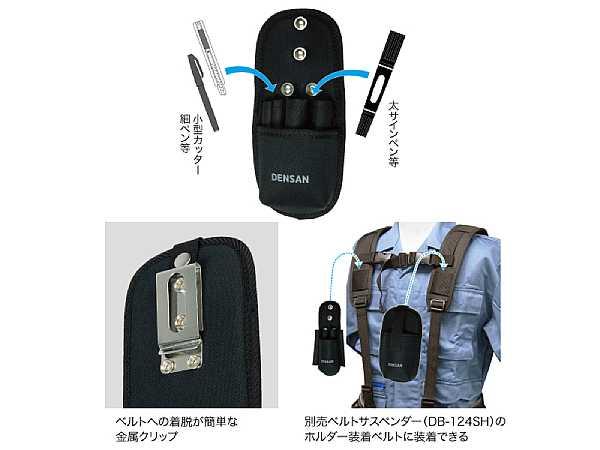 安全帯や胴ベルトを外さずに着脱可能な 金属クリップ採用 ペンホルダー(大) ●別売ベルトサスペンダー(DB-124SH)に装着できる ●ペンホルダー 大 ●太サインペンや小型カッター等の収納に ●装着可能ベルト幅:50mm ■ 仕様 ・材質 本体:ポリエステル クリップ:ステンレス ・サイズ:幅95×奥行45×高さ210mm ・質量:80g ・原産国:中国