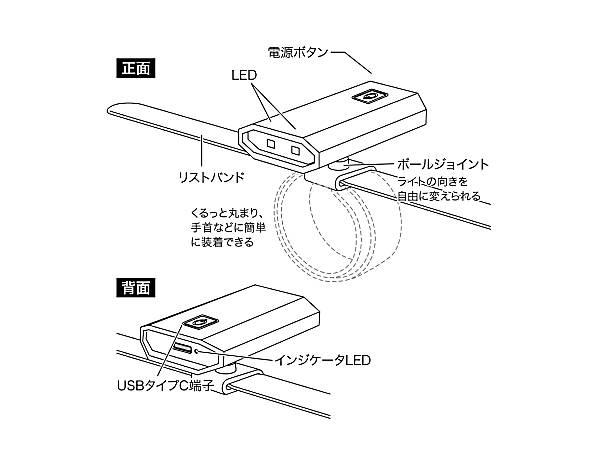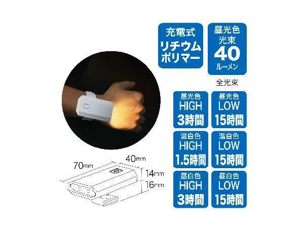 手元に光を!どこでも使える便利なLEDライト ●リストバンドで簡単に装着できるLEDライト ●昼光色・温白色・昼白色の3色の点灯が可能 ●明るさ無段階調光 ●充電式(リチウムポリマー) ●ボールジョイント ・ライトの向きを自由に変えられる ■ 仕様 ・本体サイズ・質量(リストバンド含む):70mm×45mm×75mm・43g ・本体サイズ・質量(本体のみ):70mm×40mm×30mm・30g ・使用光源:チップLED ・消費電力:2W ・LED数:2個 ・色温度 昼光色:7100K 温白色:3500K 昼白色:5000K ・全光束:40lm (昼光色) ・充電時間:1.6時間 ・連続点灯時間 昼光色:HIGH 3時間 / LOW 15時間 温白色:HIGH 1.5時間 / LOW 15時間 昼白色:HIGH 3時間 / LOW 15時間 ・内蔵電池:リチウムポリマー電池(3.7V 400mAh) ・充電端子:USBタイプC端子 ※USBタイプCケーブルとUSBアダプター(5V 1A)は、 付属していません。別途ご用意ください。 ・材質 ABS、シリコン ・原産国:中国