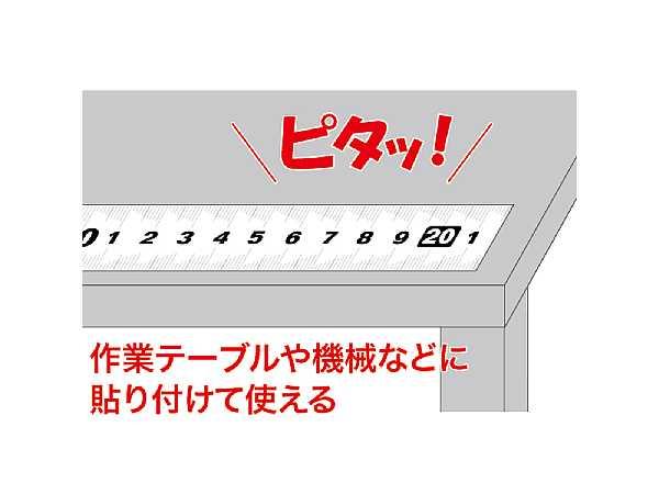 簡単に貼り付けできる、粘着テープ付メジャー! ●作業テーブルや機械等に貼り付けて使える ●摩擦に強く目盛りが消えにくいナイロンコーティング ●見やすい段差型目盛 ●はさみで切れる ●仮止め穴(テープ両端・約φ2mm) 釘などで仮固定できる ●粘着テープ付なので剥離紙をはがして簡単に貼れる ■ 仕様 ・測定長:2.0m ・テープ幅:13mm ・テープ厚:0.3mm(両面テープ含む) ●材質:SK材(ナイロンコーティング) ・原産国:中国