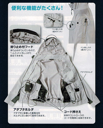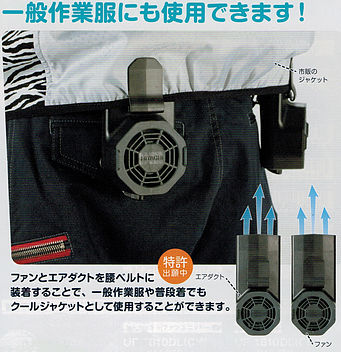 使用したいシーンに合わせて素材が選べ、さらに「ファン」と「エアダクト」を腰ベルトに装着することで、一般作業服や普段着でもクールジャケットとして使用することができます。