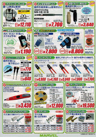 ケーブルストリッパーや音響発光式LEDライト内蔵検電器などの新商品や、柱上安全帯用ベルト&電工ポケットなどが特価になっているものもございます。