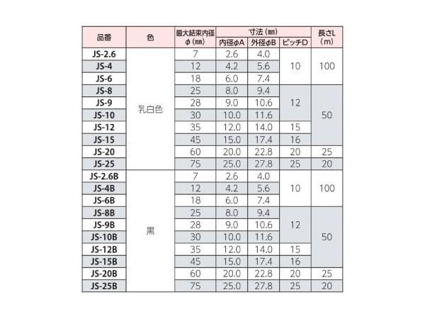 スパイラルチューブ JAPPY JS-2.6/JS-4/JS-6/JS-8/JS-9/JS-10/JS-12/JS-15/JS-20/JS-25/JS-2.6B/JS-4B/JS-6B/JS-8B/JS-9B/JS-10B/JS-12B/JS-15B/JS-20B/JS-25B 低工数で迅速な施工が可能で繰り返し使えます 束線の湾曲部、盤間渡り線などを美しく保護 低工数で迅速に施工可能 どの位置からも電線の取り出しが可能 容易に取り付け、取り外しができ、何度も使用可能 一般仕様 ■材質:ポリエチレン ■使用周囲温度:-40℃~60℃ 【JS-2.6/JS-2.6B】 ■長さ:100M ■色:乳白/黒 ■耐候性:なし/あり ■最大結束内径:φ7mm ■内径:φ2.6mm ■外径:φ4.0mm ■ピッチ:10mm 【JS-4/JS-4B】 ■長さ:100M ■耐候性:なし/あり ■色:乳白/黒 ■最大結束内径:φ12mm ■内径:φ4.2mm ■外径:φ5.6mm ■ピッチ:10mm 【JS-6/JS-6B】 ■長さ:100M ■耐候性:なし/あり ■色:乳白/黒 ■最大結束内径:φ18mm ■内径:φ6.0mm ■外径:φ7.4mm ■ピッチ:10mm 【JS-8/JS-8B】 ■長さ:50M ■色:乳白/黒 ■耐候性:なし/あり ■最大結束内径:φ25mm ■内径:φ8.0mm ■外径:φ9.4mm ■ピッチ:12mm 【JS-9/JS-9B】 ■長さ:50M ■色:乳白/黒 ■耐候性:なし/あり ■最大結束内径:φ28mm ■内径:φ9.0mm ■外径:φ10.6mm ■ピッチ:12mm 【JS-10/JS-10B】 ■長さ:50M ■色:乳白/黒 ■耐候性:なし/あり ■最大結束内径:φ30mm ■内径:φ10.0mm ■外径:φ11.6mm ■ピッチ:12mm 【JS-12/JS-12B】 ■長さ:50M ■色:乳白/黒 ■耐候性:なし/あり ■最大結束内径:φ35mm ■内径:φ12.0mm ■外径:φ14.0mm ■ピッチ:15mm 【JS-15/JS-15B】 ■長さ:50M ■色:乳白/黒 ■耐候性:なし/あり ■内径:φ15.0mm ■外径:φ17.4mm ■ピッチ:16mm 【JS-20/JS-20B】 ■長さ:25M ■色:乳白/黒 ■耐候性:なし/あり ■最大結束内径:φ60mm ■内径:φ20.0mm ■外径:φ22.8mm ■ピッチ:20mm 【JS-25/JS-25B】 ■長さ:20M ■色:乳白/黒 ■耐候性:なし/あり ■最大結束内径:φ75mm ■内径:φ25.0mm ■外径:φ27.8mm ■ピッチ:25mm