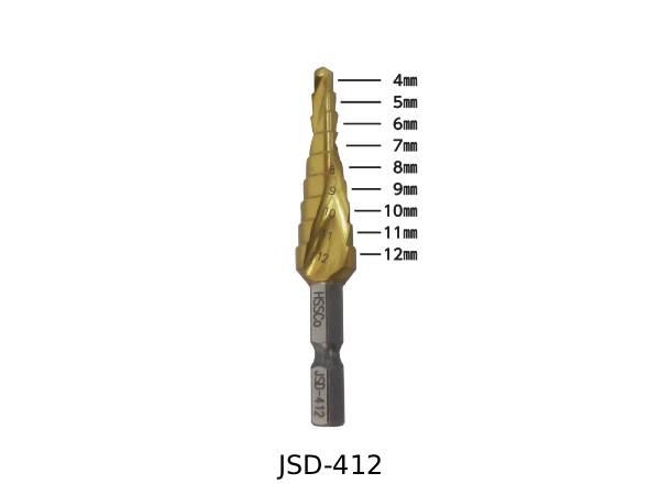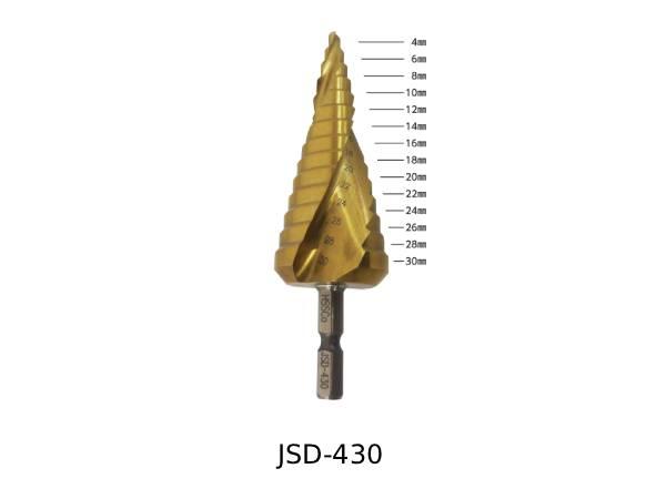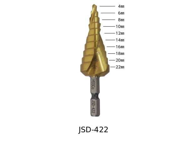 ステップドリル JSD-412/JSD-422/JSD-430 JAPPY ■製品特徴 切れ味・耐久性抜群のコバルトハイス鋼を使用! 鉄板(2.0mm以下)、ステンレス板(1.6mm以下)などの穴あけに最適 独自のスパイラル溝形状で切れ味抜群 バリ取り、穴の拡張、面取りなどに使用 センターポンチ作業不要 六角軸シャンク6.35㎜ 【JSD-412】 全長:71.5㎜ 開口穴:4~12㎜ 段数:9段 質量:32g 【JSD-422】 全長:86㎜ 開口穴:4~22㎜ 段数:10段 質量:75g 【JSD-430】 全長:101㎜ 開口穴:4~30㎜ 段数:14段 質量:172g