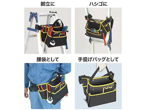 脚立やハシゴに取り付けて、高所で便利に使える ●数多くのポケットやサックが、多彩なツールに対応 ●脚立に…正面・側面ともに取り付けOK ●ハシゴに…ワンタッチ着脱のバックルでハシゴにも取り付け簡単 ●腰袋として…ベルトで腰に巻くこともできて、持ち運びにも便利 ●手提げバッグとして…手提げツールバッグとしても使えます ●サイズ:幅280×奥行200×高さ230mm ・原産国:中国