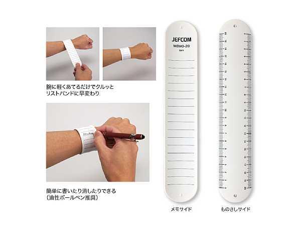 腕に当てて装着、「メモれる」リストバンド ●伸ばせば簡易ものさし(20cm)としても使える ●腕に軽くあてるだけで、クルッとリストバンドに早変わり ●簡単に書いたり消したりできる(油性ボールペン推奨) ・本体サイズ・質量:50mm×10mm×290mm・43g ・材質 シリコン・金属 ・原産国:中国