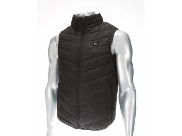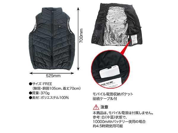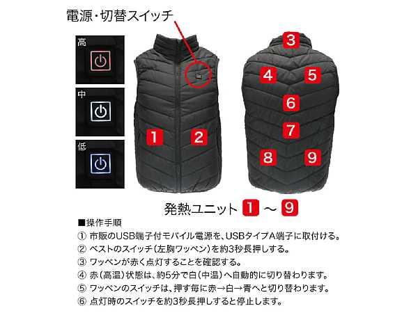 約10秒で温まる発熱ユニット内蔵ベスト ●9箇所の発熱ユニットが身体を前後から温める ●市販のモバイル電源(USBタイプA端子)を使用 ・モバイル電源収納ポケット接続ケーブル付 ・参考:白(中温)状態で、10000mAhバッテリー使用の場合 約4.5時間使用可能 ●左胸部電源切替スイッチの色で設定温度が確認できる ●サイズ:FREE(胸囲・胴囲105cm、着丈70cm) ●素材:ポリエステル100% ■操作手順 1.市販のUSB端子付モバイル電源を、USBタイプA端子に取付ける。 2.ベストのスイッチ(左胸ワッペン)を約3秒長押しする。 3.ワッペンが赤く点灯することを確認する。 4.赤(高温)状態は、約5分で白(中温)へ自動的に切り替わります。 5.ワッペンのスイッチは、押す毎に赤→白→青へと切り替わります。 6.点灯時のスイッチを約3秒長押しすると停止します。 ■ 仕様 ・本体サイズ・質量:525mm×40mm×700mm・370g ・出力電圧:5V ・出力電流:2A ・温度切替(3段階) 高:約55℃(胸部ランプ赤色) 中:約45℃(胸部ランプ白色) 低:約35℃(胸部ランプ青色)